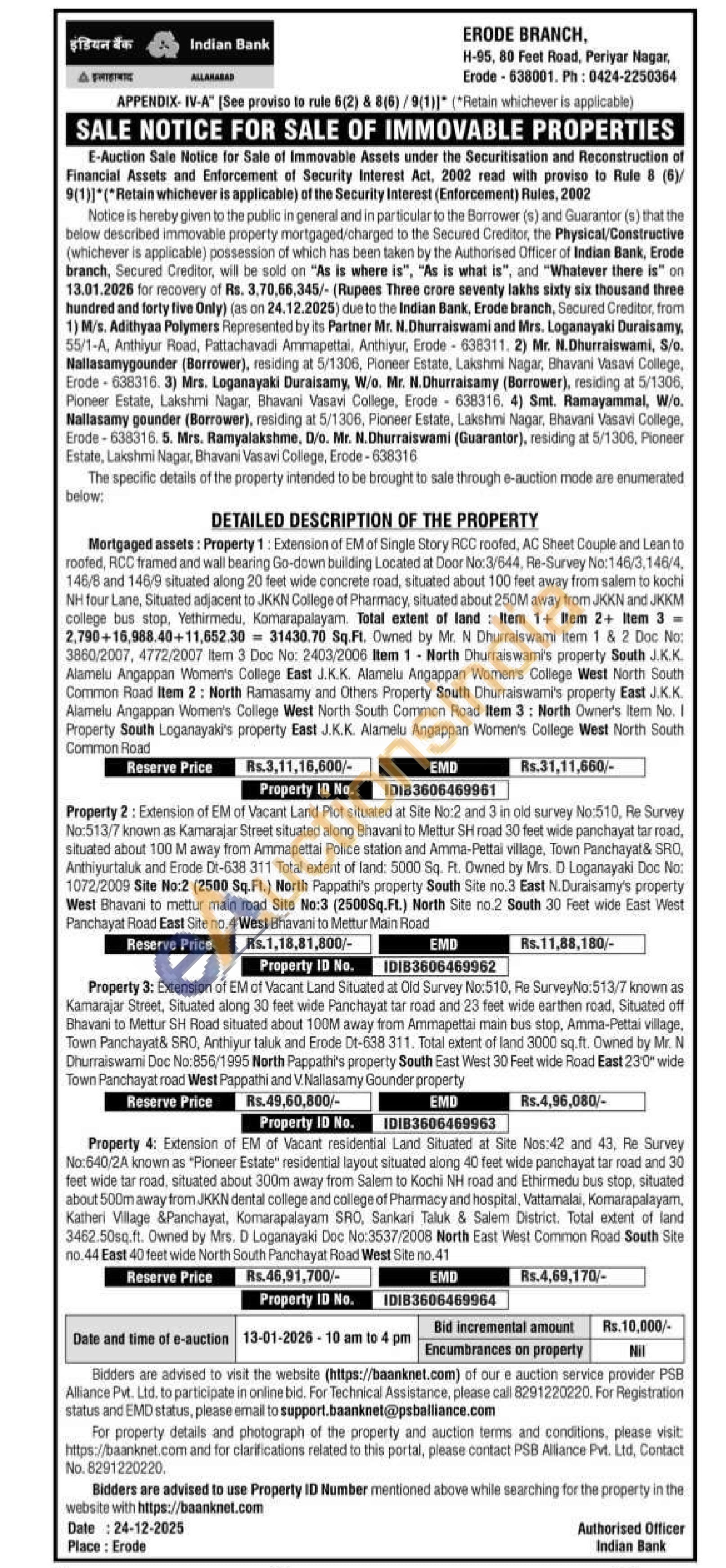 Property 3: Extension of EM of Vacant Land Situated at Old Survey No:510, Re SurveyNo:513/7 known as Kamarajar Street, Situated along 30 feet wide Panchayat tar read and 23 feet wide earthen road, Situated off Bhavani to Mettur SH Road situated about 100M away from Ammapettai main bus stop. Amma-Pettai village, Town Panchayat& SRO, Anthiyur taluk and Enode Dt-638 311. Total extent of land 3000 sq.ft. Owned by Mr. N Dhurraiswarni Doc No:856/1995 North Pappathit's property South East West 30 Feet wide Road East 230" wide Town Panchayat road West Pappathi and Nailasamy Gounder property