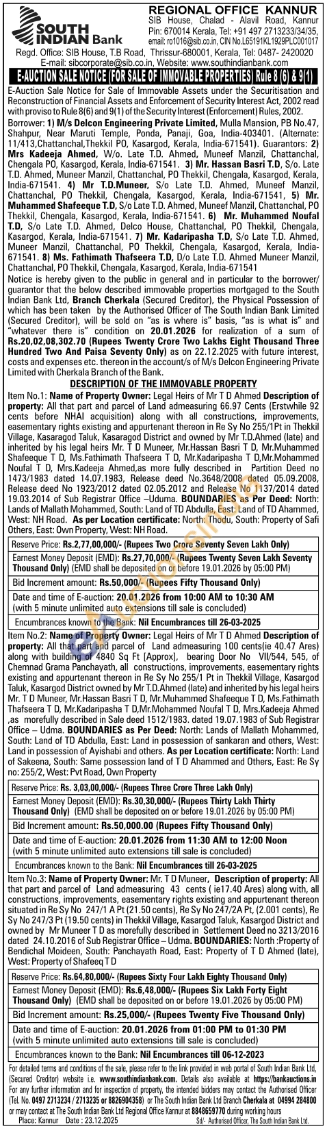 Item No.2: Name of Property Owner: Legal Heirs of Mr TD Ahmed Description of property: All that part and parcel of Land admeasuring 100 cents(ie 40.47 Ares) along with building of 4840 Sq Ft (Approx), bearing Door No VII/544, 545, of Chemnad Grama Panchayath, all constructions, improvements, easementary rights existing and appurtenant thereon in Re Sy No 255/1 Pt in Thekkil Village, Kasargod Taluk, Kasargod District owned by Mr T.D.Ahmed (late) and inherited by his legal heirs Mr. TD Muneer, Mr.Hassan Basri T D, Mr. Muhammed Shafeeque TD, Ms. Fathimath Thafseera T D, Mr.Kadaripasha T D,Mr.Mohammed Noufal T D, Mrs.Kadeeja Ahmed as morefully described in Sale deed 1512/1983. dated 19.07.1983 of Sub Registrar Office Udma. BOUNDARIES as Per Deed: North: Lands of Mallath Mohammed, South: Land of TD Abdulla, East: Land in possession of sankaran and others, West: Land in possession of Ayishabi and others. As per Location certificate: North: Land of Sakeena, South: Same possession land of TD Ahammed and Others, East: Re Sy no: 255/2, West: Pvt Road, Own Property