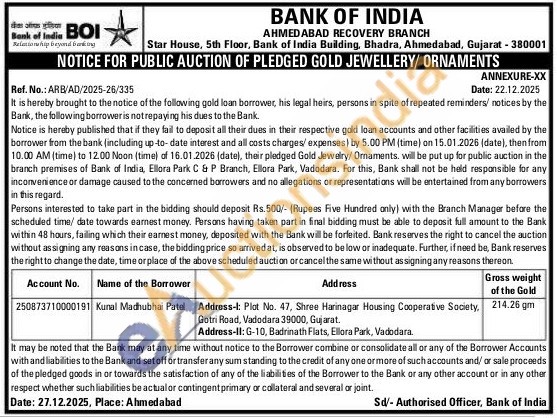 Bank of India Gold Auctions Auction in Ahmedabad