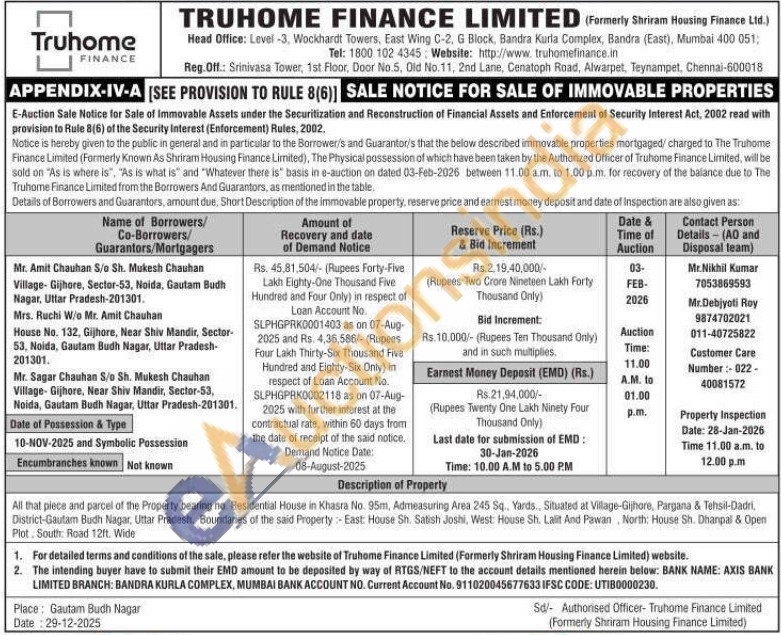 All that piece and parcel of the Property bearing no. Residential House in Khasra No. 95m, Admeasuring Area 245 Sq., Yards., Situated at Village-Gijhore, Pargana & Tehsil-Dadri, District-Gautam Budh Nagar, Uttar Pradesh. Boundaries of the said Property: East: House Sh. Satish Joshi, West: House Sh. Lalit And Pawan North: House Sh. Dhanpal & Open Plot, South Road 12ft. Wide
