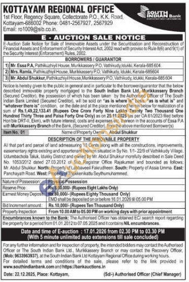 DESCRIPTION OF THE IMMOVABLE PROPERTY : All that part and parcel of land admeasuring 10 Cents along with all the constructions, improvements, easementary rights existing and appurteniant thereon situated in Sy No. 1/1-22/9 of Vathikkudy Vilage, Udumbachols Taluk, idukky District and owned by Mr. Abdul Shukkur morefully described in Sale Deed No 1053/2012 dated 27.03.2012 of Sub Registrar Office Rajakumari and bounded as follows: Mr. Abdul Shukkur. North: Property of Labbaveell Fairudheen South: Property of Assia Umma. East: Panchayath Road West: Property of Theklenkattu Seythumuhammed
