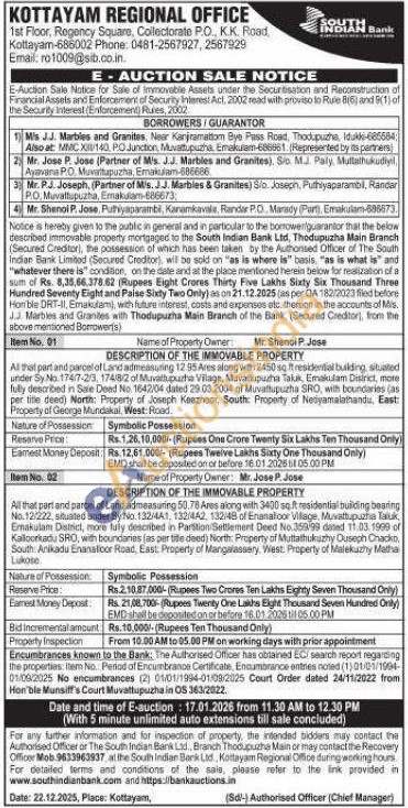 DESCRIPTION OF THE IMMOVABLE PROPERTY : All that part and parcel of Land admeasuring 12.95 Ares along with 2450 sq.ft residential building, situated under Sy No.174/7-2/3, 174/8/2 of Muvattupuzha Vilage, Mavallupuzha Taluk, Ernakulam District, more fully described in Sale Deed No. 1642/04 dated 29.03.2004 of Muvattupuzha SRO, with boundaries (as per title deed) North: Property of Joseph Keezhoor, South: Property of Netiyamalathandu, East: Property of George Mundakal, West: Road