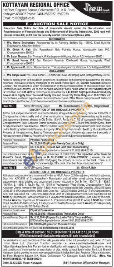 DESCRIPTION OF THE IMMOVABLE PROPERTY : All that part and parcel of land to an extent 3.43 Ares (01.41. Ares+02.02 Ares) along with building bearing Door No. XXXV1/54 of Changanacherry Municipality and all other constructions, improvements, easementary rights existing and appurtenant thereon situated in Old Sy No. 180/17A, B. 185/6,7, 180/17A, B. 185/6, 7, Re.Sy No. 15, 15/1/1 of Vazhappally West Village, Changanacherry Taluk, Kottayam District owned by Mr. Girish R Nair, more or fully described in Sale Deed No. 280/2015 dated 05.02.2015 of Changanacherry SRO, Sale Deed No. 1025/2015 dated 20.05.2015 of Changanacherry SRO and Sale Deed No. 1046/2015 dated 20.05.2015 of Changanacherry SRO and bounded on the North by Properties of Radhakrishnan Pillai & Vijayakumar, South by Nadappu Road, East by Municipal Road & West by Properties of Unnikrishnan & Ponnamma Pillai (for 01.41 Ares) & North by Private Road, South by Puthettu property & Nadappu vazhi; East by Municipal Road & West by Pond & property sold by Unnikrishnan (for 02.02 Ares of land)