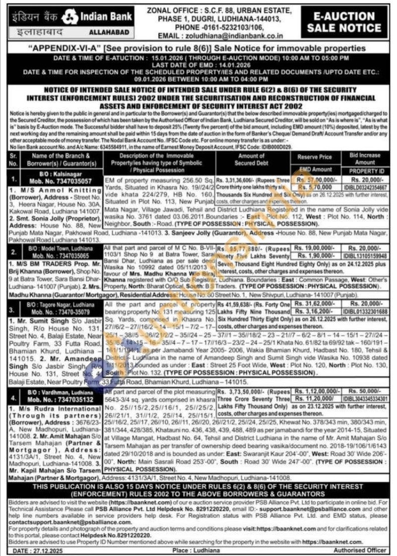 EM of property measuring 256.50 Yards, Situated in Khasra No. 19//24/vide khata 224/279, HB No. 160. Situated in Plot No. 113, New Punjab Mata wasikaNagar, Village Jawadi, Tehsil and District Ludhiana Registered in the name of Sonia Jolly vide No. 3761 dated 03.06.2011.Boundaries: East: Plot No. 112, West: Plot No. 114, North: Neighbor, South:-Road. (TYPE OF POSSESSION: PHYSICAL POSSESSION).