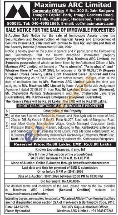 All that part & parcel of Residential Vacant Land (Non-Agri) with an extent of Ac.0-20cs or 968 Sq. Yards in S.No.2/1, Patta No.207, South side of Mangamur Road, near Marmi Chettu, Mamidipalem Village, Ongole Municipal Corporation Limits, Prakasam District, Andhra Pradesh, belonging to Mis. Kartheekeya Enterprises and bounded by: East: Passage Some Extent, Plots site some extent, South: Ac. 0.20 cents of site purchased by claimant M/s. Kartheekeya Enterprises, West: Road, North: Ac. 0.20 cents of site purchased by claimant Mis. Kartheekeya Enterprises