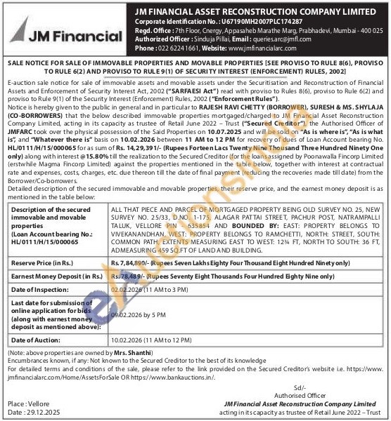 ALL THAT PIECE AND PARCEL OF MORTGAGED PROPERTY BEING OLD SURVEY NO. 25, NEW SURVEY NO. 25/33, D.NO. 1-175, ALAGAR PATTAI STREET, PACHUR POST, NATRAMPALLI TALUK, VELLORE PIN 635854 AND BOUNDED BY: EAST: PROPERTY BELONGS TO VIVEKANANDHAN, WEST: PROPERTY BELONGS TO RAMCHETTI, NORTH STREET, SOUTH COMMON PATH, EXTENTS MEASURING EAST TO WEST: 12 3/4 FT, NORTH TO SOUTH 36 FT, ADMEASURING 459 SQ.FT OF LAND AND BUILDING