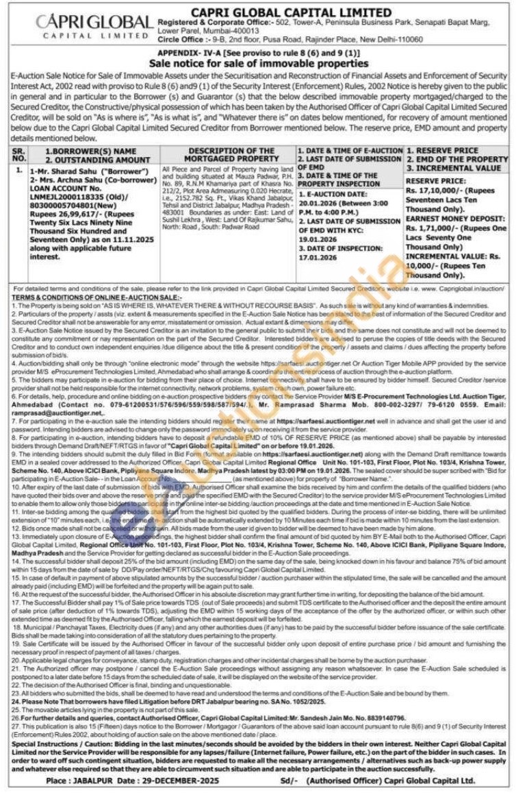All Piece and Parcel of Property having land and building situated at Mauza Padwar, P.H. No. 89, R.N.M Khamariya part of Khasra No. 212/2, Plot Area Admeasuring 0.020 Hecrate, Le., 2152.782 Sq. Ft., Vikas Khand Jabalpur Tehsil and District Jabalpur, Madhya Pradesh 483001 Boundaries as under: East: Land of Sushil Lekhra, West: Land Of Rajkumar Sahu, North: Road, South: Padwar Road