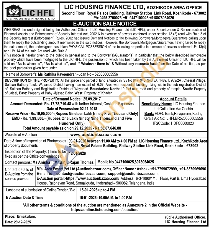 DESCRIPTION OF THE PROPERTY: All that piece and parcel of land situated in Sy No 947, 945, 940/3A, 1489/1, 939/2A, Cheeral Village, Sulthan Bathery Taluk, Wayanad District having an extent of 6.07 Ares with residential building lying within the sub registration District of Sulthan Bathery and Registration District of Wayanad. Boundaries: North: 10 feet mud road and property of temple, South: Property of Jaleel, East: Property of Baby @Issac Baby, West: Property of Khader.
