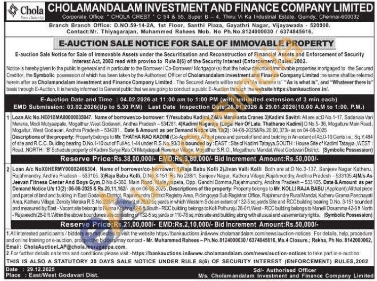 Descriptions of the property: Property belongs to Mr. THATHA RAD KADIMI (Co-Applicant): All that piece and parcel of land and building in An extent of Ac. 0-10 Cents ie., Sq.Y.484 of site and R.C.C. Building bearing D.No. 1-10 out of Full Ac. 1-44 under R.S. No. 93/3 is bounded by: EAST: Site of Kadimi Tatayya SOUTH: House Site of Kadimi Tatayya, WEST: Road. NORTH: 'B' Schedule property of Kadimi Surya Rao Of Mutyalapalli Revenue Village, Mogalthur S.RO, Mogalthuru Mandal, West Godavari District