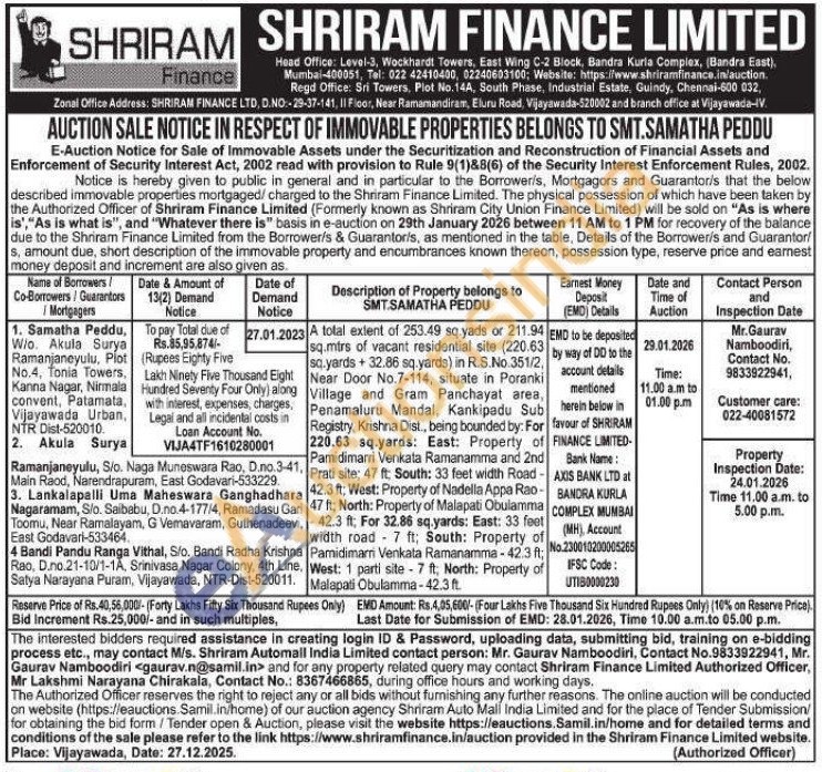A total extent of 253.49 sq yads or 211.94 sq.mtrs of vacant residential site (220.63) sq.yards + 32.86 sq.yards) in R.S.No. 351/2, Near Door No.7-114, situate in Poranki Village and Gram Panchayat area, Penamaluru Mandal, Kankipadu Sub Registry, Krishna Dist., being bounded by: For 220.63 sq.yards: East: Property of Pamidimari Venkata Ramanamma and 2nd Prati site; 47 ft: South: 33 feet width Road -42.3 ft; West: Property of Nadella Appa Rao-47 ft; North: Property of Malapati Obulamma 42.3 ft, For 32.86 sq.yards: East: 33 feet width road 7 ft; South: Property of Pamidimarri Venkata Ramanamma-42.3 ft: West: 1 parti site - 7 ft, North: Property of Malapati Obulamma-42.3 ft.