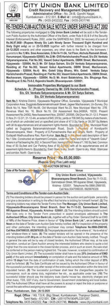 Item No.1: Krishna District, Vijayawada Registrar Office, Gunadala, Vijayawada F Municipal Corporation Area, Duggirala Balaramakrishnaiah Street, Jageer Machavaram, Us-Survey, Dry Block No.14, New TSR No 66. Old Miniopal Ward No.23. New Municipal Ward No. 278 Revenue Ward No. 16, Block No. 19, Old Assessment Nos 24560A, 19230, Present Assessment No 24582, New Assessment Nos. 200567, 200595, Old Door No.31-12-3. Present D. Nos 31-12-3/1, 31-12-44, an extent of 845.3/5 Sq yards or 706 845 Sq meters of site therein, out of which an undivided and un specified joint share of 47.0 Sa 'Yants or 39.297 5 Meters with all its appurtenances and all easement rights thereto Bounded by, East: Municipal Road called as Dugginala Balaramakrishnalah Road, South Property of Kondiparth Bhavansarayana. West: Property of E Pumachandra Rao and others, North Property of Gullapalli Madhusudhana Rao, Ram Kumar, Item No.2: In the above sald description of Item No.1 Site. Constructed an Apartment Complex, under the name and style of "Vasanth Goku where in a Flat bearing No 302, in Second Floor having a Plinth Area of 1.160 Sq feet. Common Area of 50 Sq feet and Car Parking Area of 60 Sq feet with all its appurtenances and al easement rights there to Bounded by: East. Open to sky, South Open to-sky, West: Staircase and corrider. North Opentosky