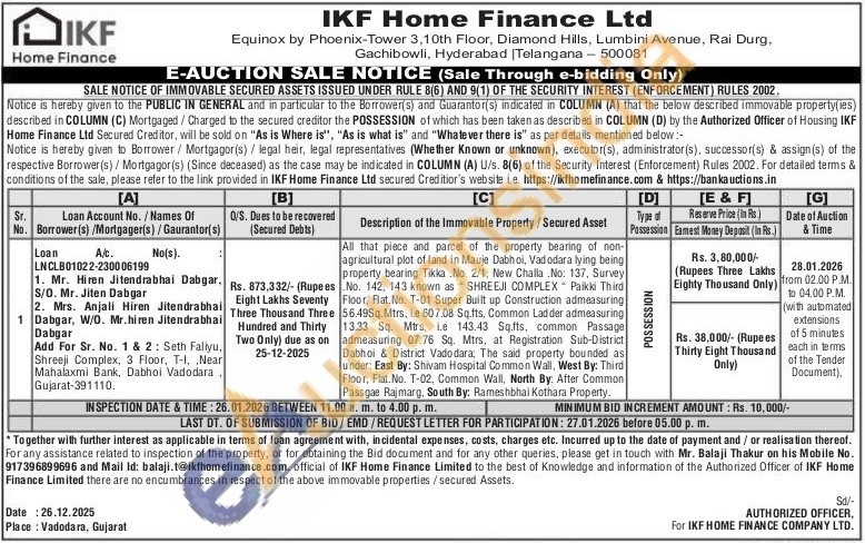 All that piece and parcel of the property bearing of non-agricultural plot of land in Mauje Dabhoi, Vadodara lying being property bearing Tikka No. 2/1, New Challa. No: 137, Survey No. 142, 143 known as SHREEJI COMPLEX Paikki Third Floor, Flat. No. T-01 Super Built up Construction admeasuring 56.49Sq.Mtrs, le 607.08 Sq.fts, Common Ladder admeasuring 13.33 Sq. Mtrs, Le 143.43 Sq.fts, common Passage admeasuring 07.76 Sq. Mtrs, at Registration Sub-District Dabhoi & District Vadodara, The said property bounded as under: East By: Shivam Hospital Common Wall, West By: Third Floor, Flat. No. T-02, Common Wall, North By. After Common Passgae Rajmarg, South By: Rameshbhai Kothara Property