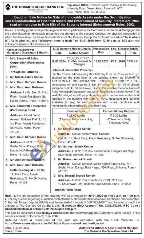 Flat No. 11 area admeasuring about 600 sq. ft. i.e. 55.76 sq. m. built up, situated on the third floor of the building known as SAMARTH APARTMENT CO-OPERATIVE HOUSING SOCIETY LTD.. constructed on land bearing S. No. 14, Hissa No. 15/1/1/5 of village Vadgaon Budruk, Taluka Haveli, District Pune within the local limits of Pune Municipal Corporation and within Registration District Haveli. The said Flat is together with proportionate share in common amenities and facilities in the building with right of ways, easement and parking available (if any) to said premises with share certificate and membership attached to said premises if any.