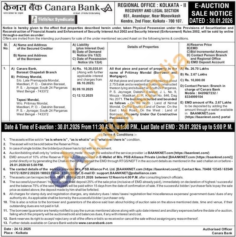 All that piece and parcel of land measuring about 2.75 Satak anda residential building constructed thereon lying and situated at South 24 Parganas, P. S. Jaynagar, Dakshin Barasat, J. L. No. 9, Mouza Mastikari, L. R. Khatian No. 846, Dag No. 2071. The building is butted and bounded as follows On the North Land of Nirmal Mondal, On the South Land of Owner, On the East Mud Road, On the West Land of Borrower. (Property Under Our Constructive Possession)