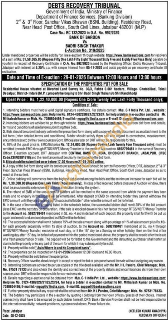 Residential House situated at Diverted Land Survey No. 30/3, Rakba 0.061 hectare, Village Ghatabilled, Tehsil Depalpur, District-Indore (M.P.): property belonging to Shri Badri Singh Thakur s/o Shri Ranchhodji