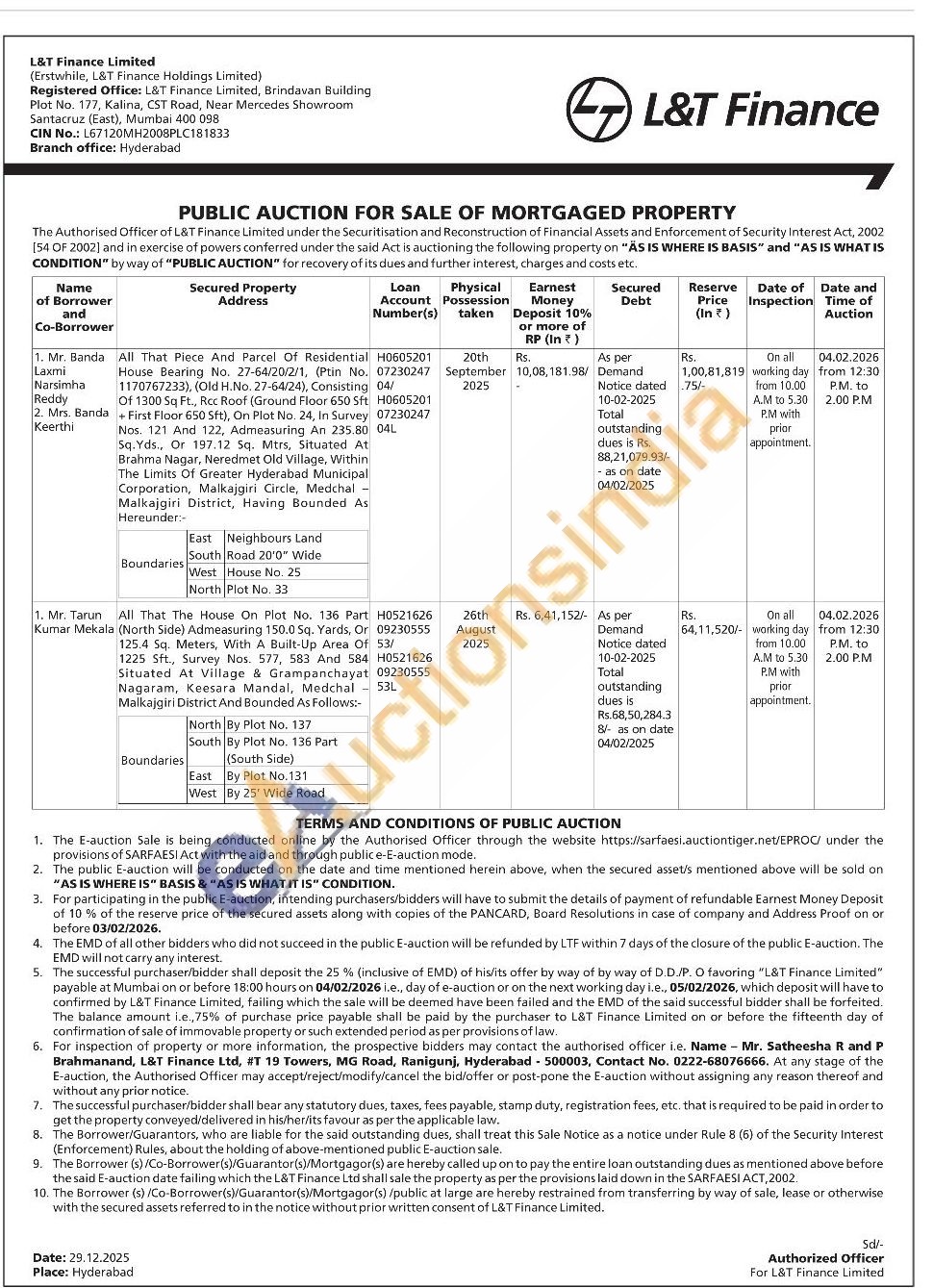 All That Piece And Parcel Of Residential House Bearing No. 27-64/20/2/1, (Ptin No. 1170767233), (Old H.No. 27-64/24), Consisting Of 1300 Sq Ft., Rec Roof (Ground Floor 650 5ft First Floor 650 Sft), On Plot No. 24, In Survey: Nos. 121 And 122, Admeasuring An 235.80 5q. Yds., Or 197.12 Sq. Mtrs, Situated At Brahma Nagar, Neredmet Old Village, Within The Limits Of Greater Hyderabad Municipal Corporation, Malkajgiri Circle, Medchal -Malkajgiri District, Having Bounded As Hereunder