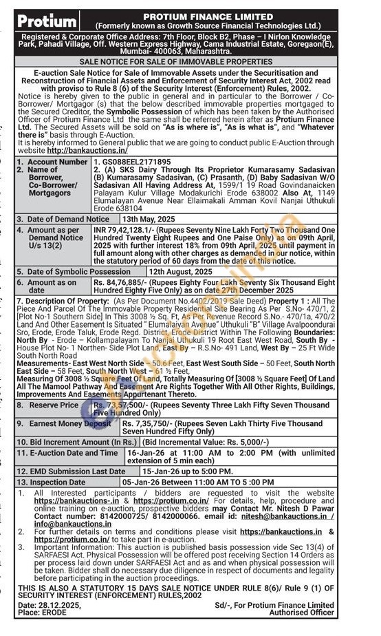 Description Of Property: (As Per Document No.4402/2019 Sale Deed) Property 1: All The Piece And Parcel Of The Immovable Property Residential Site Bearing As Per S.No-470/1, 2 [Plot No-1 Southern Side] In This 3008 ½ Sq. Ft, As Per Revenue Record S.No.- 470/1a, 470/2 Land And Other Easement Is Situated "Elumalaiyan Avenue" Uthukuli "B" Village Avalpoondurai Sro, Erode, Erode Taluk, Erode Regd. District, Erode District Within The Following Boundaries: North By Erode Kollampalayam To Nanjai Uthukuli 19 Root East West Road, South By -House Plot No-1 Northen- Side Plot Land, East By R.S.No- 491 Land, West By- 25 Ft Wide South North Road