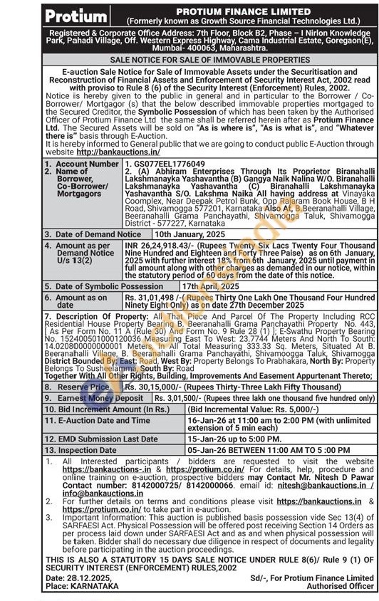 Description Of Property: All That Piece And Parcel Of The Property Including RCC Residential House Property Bearing B. Beeranahalli Grama Panchayathi Property No. 443, As Per Form No. 11 A (Rule 30) And Form No. 9 Rule 28 (1)); E-Swathu Property Bearing No. 152400501000120036 Measuring East To West: 23.7744 Meters And North To South: 14.020800000000001 Meters, In All Total Measuring 333.33 Sq. Meters, Situated At B. Beeranahalli Village, B. Beeranahalli Grama Panchayathi, Shivamoogga Taluk, Shivamogga District Bounded By: East: Road, West By: Property Belongs To Prabhakara, North By: Property Belongs To Susheelamma, South By: Road