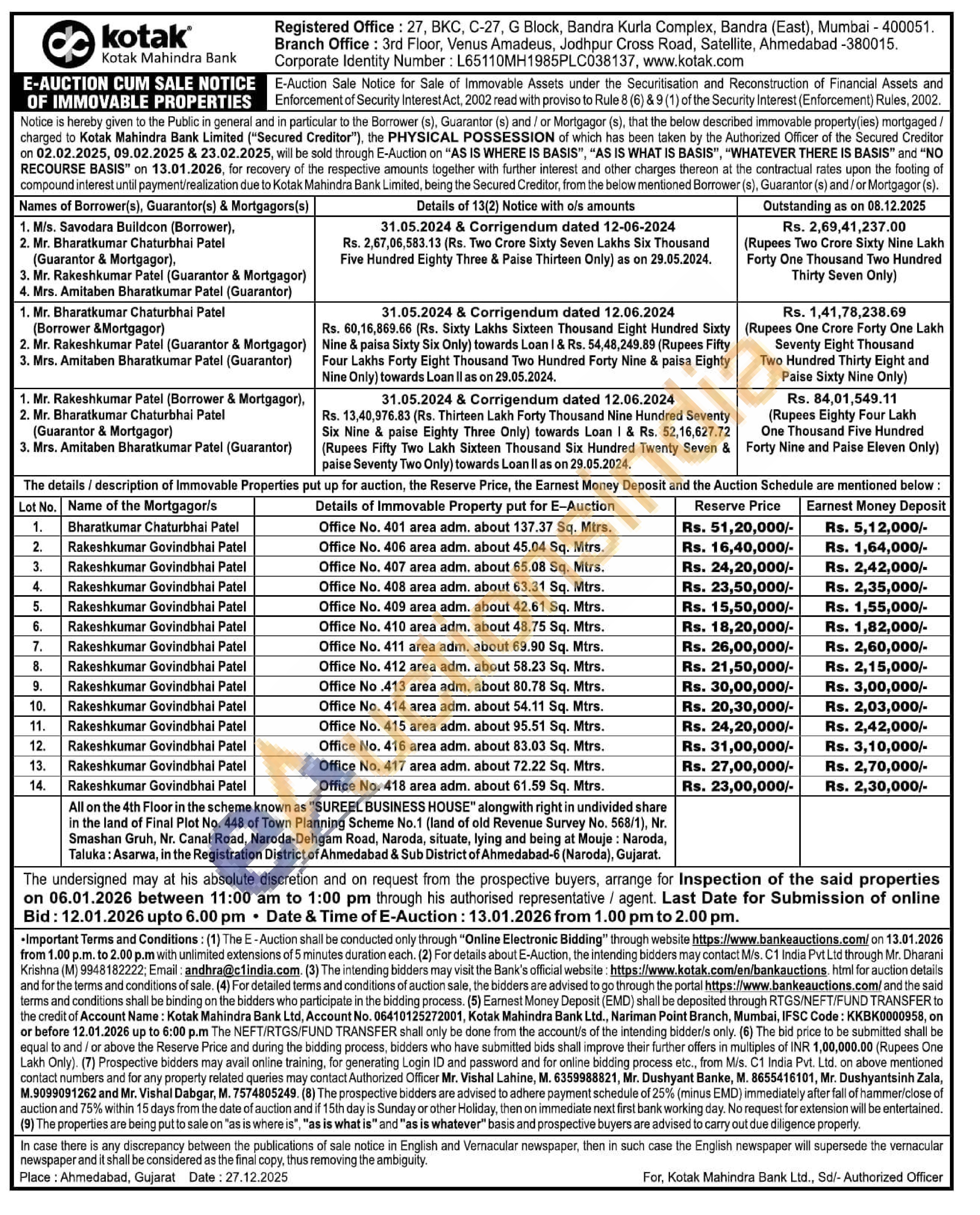 1) All on the 4th Floor in the scheme known as "SUREEL BUSINESS HOUSE" alongwith right in undivided share in the land of Final Plot No. 448 of Town Planning Scheme No.1 (land of old Revenue Survey No. 568/1), Nr. Smashan Gruh, Nr. Canal Road, Naroda-Dehgam Road, Naroda, situate, lying and being at Mouje: Naroda, Taluka: Asarwa, in the Registration District of Ahmedabad & Sub District of Ahmedabad-6 (Naroda), Gujarat