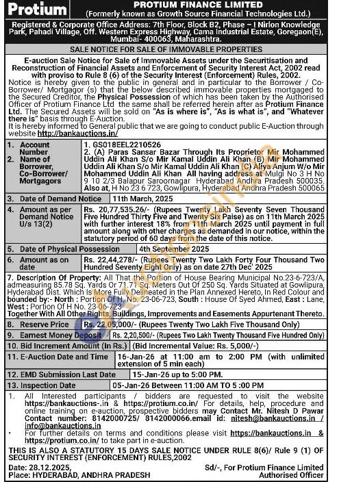 Description Of Property: All That the Portion of House Bearing Municipal No.23-6-723/A, admeasuring 85.78 Sq. Yards Or 71.71 Sq. Meters Out Of 250 Sq. Yards Situated at Gowlipura, Hyderabad Dist. Which Is More Fully Delineated in the Plan Annexed Hereto, In Red Colour and bounded by:- North: Portion Of H. No. 23-06-723, South: House Of Syed Ahmed, East: Lane, West: Portion Of H No. 23-06-723
