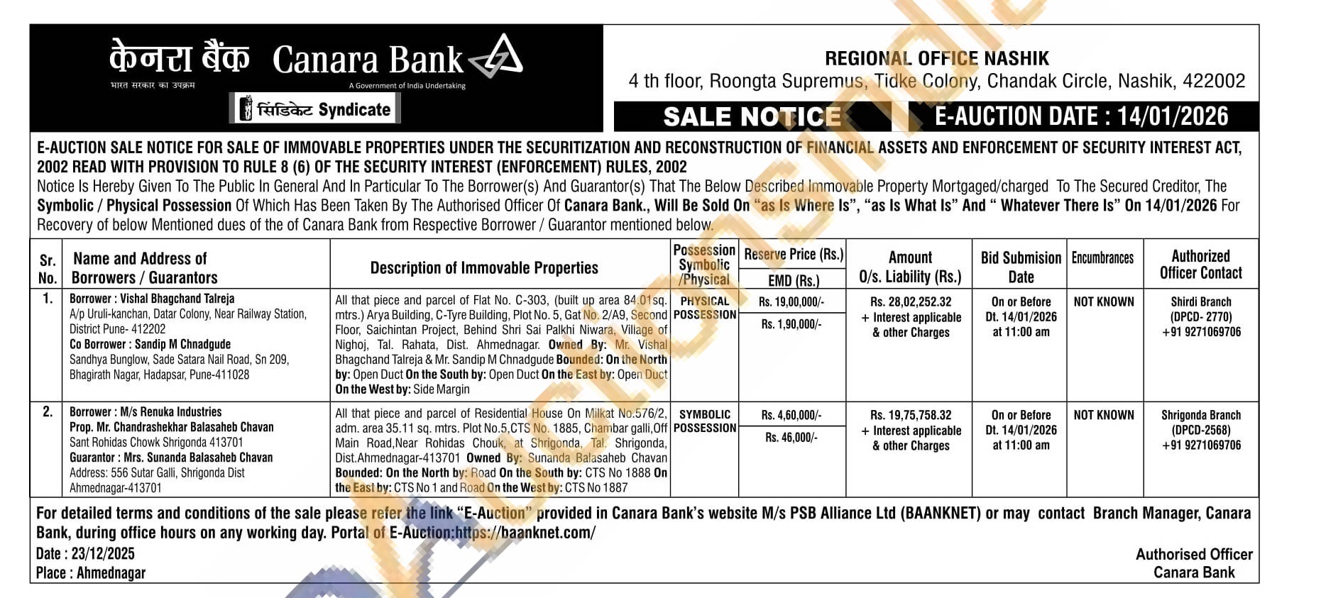 All that piece and parcel of Residential House On Milkat No.576/2, adm. area 35.11 sq. mtrs. Plot No.5,CTS No. 1885, Chambar galli, Off Main Road, Near Rohidas Chouk, at Shrigonda, Tal. Shrigonda, Dist Ahmednagar-413701 Owned By: Sunanda Balasaheb Chavan Bounded: On the North by: Road On the South by: CTS No 1888 On the East by: CTS No 1 and Road On the West by: CTS No 1887
