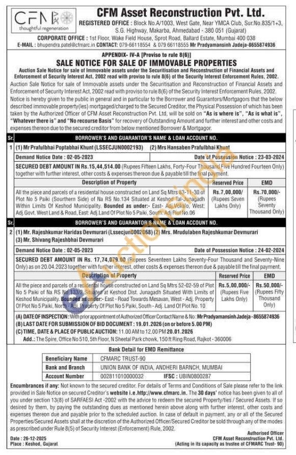 All the piece and parcels of a residental house constructed on Land Sq Mtrs 52-02-59 of Plot No 5 Paiki of Na RS No 133/2 Situated at Keshod Dist. Junagadh Situated With Limits of Keshod Municipality. Bounded as under:- East-Road Towards Mesavan, West-Adj. Property Of Plot No 5 Paiki, North-Adj. Property Of Plot No 5 Paiki, South-Adj. Land Of Plot No. 10