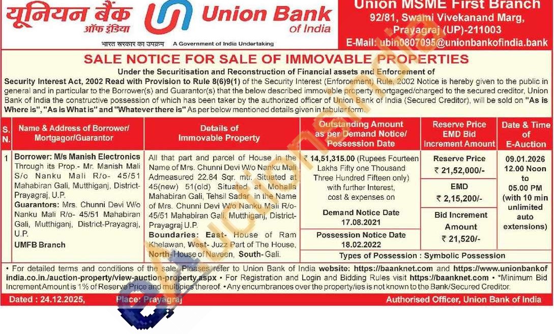All that part and parcel of House in the Name of Mrs. Chunni Devi Wio Nanku Mali Admeasured 22.84 Sqr. mtr. Situated at 45(new) 51 (old) Situated at Mohalla Mahabiran Gali, Tehsil Sadar in the Name of Mrs. Chunni Devi W/o Nanku Mali Rio-45/51 Mahabiran Gali, Mutthiganj, District-Prayagraj U.P.
