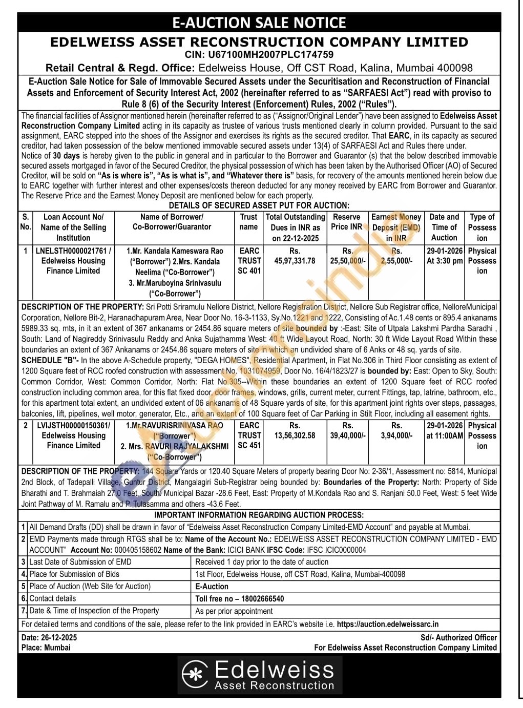 DESCRIPTION OF THE PROPERTY: Sri Potti Sriramulu Nellore District, Nellore Registration District, Nellore Sub Registrar office, Nellore Municipal Corporation, Nellore Bit-2, Haranadhapuram Area, Near Door No. 16-3-1133, Sy.No. 1221 and 1222, Consisting of Ac. 1.48 cents or 895.4 ankanams 5989.33 sq. mts, in it an extent of 367 ankanams or 2454.86 square meters of site bounded by:-East: Site of Utpala Lakshmi Pardha Saradhi South: Land of Nagireddy Srinivasulu Reddy and Anka Sujathamma West: 40 ft Wide Layout Road, North: 30 ft Wide Layout Road Within these boundaries an extent of 367 Ankanams or 2454.86 square meters of site in which an undivided share of 6 Anks or 48 sq. yards of site. SCHEDULE "B"- In the above A-Schedule property, "DEGA HOMES", Residential Apartment, in Flat No.306 in Third Floor consisting as extent of 1200 Square feet of RCC roofed construction with assessment No. 1031074959, Door No. 16/4/1823/27 is bounded by: East: Open to Sky, South: Common Corridor, West: Common Corridor, North: Flat No.305-Within these boundaries an extent of 1200 Square feet of RCC roofed construction including common area, for this flat fixed door, door frames, windows, grills, current meter, current Fittings, tap, latrine, bathroom, etc., for this apartment total extent, an undivided extent of 06 ankanams of 48 Square yards of site, for this apartment joint rights over steps, passages, balconies, lift, pipelines, well motor, generator, Etc., and an extent of 100 Square feet of Car Parking in Stilt Floor, including all easement rights.