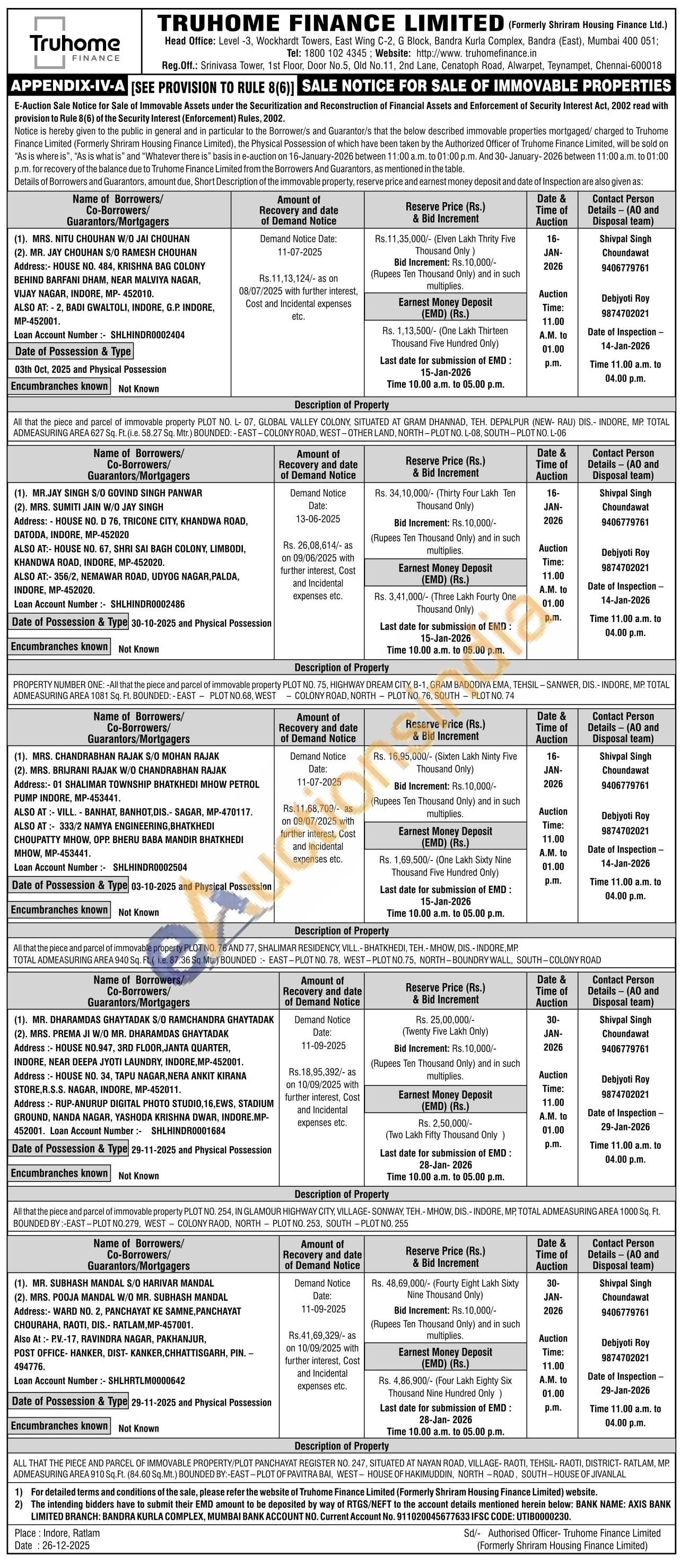 PROPERTY NUMBER ONE: -All that the piece and parcel of immovable property PLOT NO. 75, HIGHWAY DREAM CITY, B-1, GRAM BADODIYA EMA, TEHSIL-SANWER, DIS.- INDORE, MP. TOTAL ADMEASURING AREA 1081 Sq. Ft. BOUNDED: -EAST PLOT NO.68, WEST COLONY ROAD, NORTH PLOT NO. 76, SOUTH PLOT NO. 74