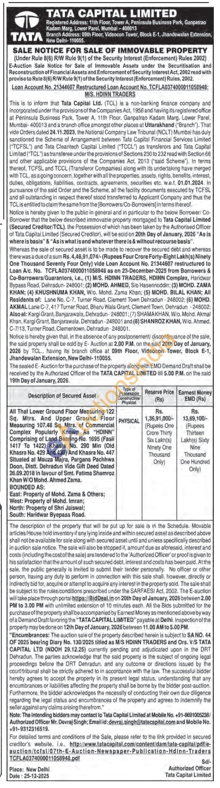All That Lower Ground Floor Measuring 122 Sq. Mtrs. And Upper Ground Floor Measuring 107.48 Sq. Mtrs. of Commercial Complex Popularly Known As "HDINN" Comprising of Land Bearing No. 1695 (Fasli 1417 Το 1422) Khasra No. 290 Min (Old Khasra No. 429 And 430) And Khasra No. 447 Situated at Mauza Majra, Pargana Pachhwa Doon, Distt. Dehradun Vide Gift Deed Dated 26.09.2018 in favour of Smt. Fatima Shamroz Khan W/O Mohd. Ahmed Zama. BOUNDED AS: East: Property of Mohd. Zama & Others; West: Property of Mohd. Imran; North: Property of Shri Jaiswal; South: Haridwar Byepass Road.