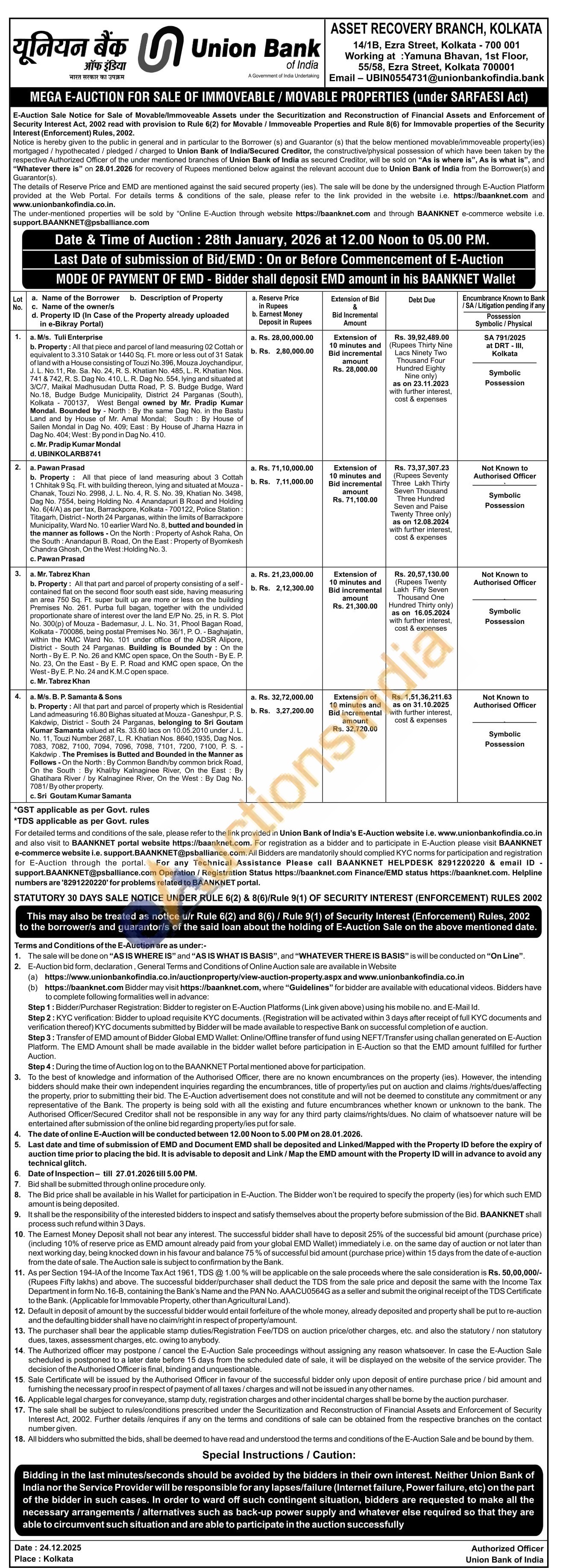 Property: All that part and parcel of property consisting of a self- contained flat on the second floor south east side, having measuring an area 750 Sq. Ft. super built up are more or less on the building Premises No. 261. Purba full bagan, together with the undivided proportionate share of interest over the land E/P No. 25, in R. S. Plot No. 300(p) of Mouza - Bademasur, J. L. No. 31, Phool Bagan Road, Kolkata -700086, being postal Premises No. 36/1, P. O.- Baghajatin, within the KMC Ward No. 101 under office of the ADSR Alipore, District South 24 Parganas. Building is Bounded by: On the North - By E. P. No. 26 and KMC open space, On the South -By E. P. No. 23, On the East By E. P. Road and KMC open space, On the West-By E. P. No. 24 and K.M.C open space.