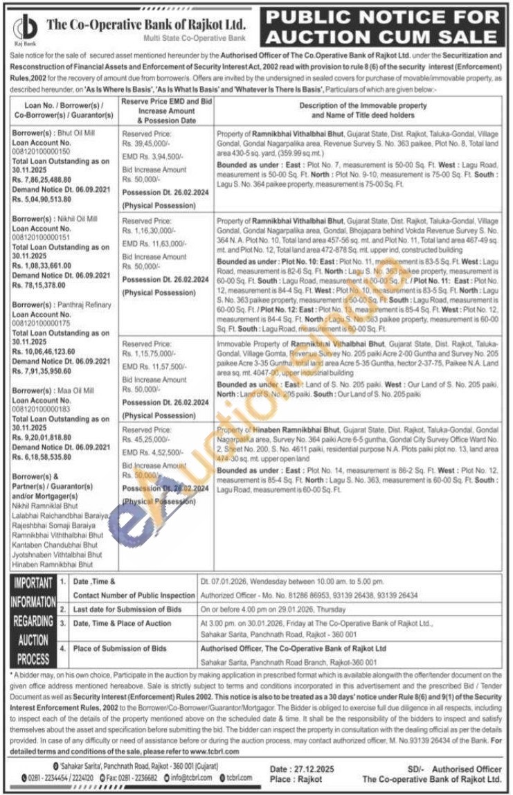 Property of Ramnikbhai Vithalbhai Bhut, Gujarat State, Dist. Rajkot, Taluka-Gondal, Village Gondal, Gondal Nagarpalika area, Gondal, Bhojapara behind Vokda Revenue Survey S. No. 364 N. A. Plot No. 10. Total land area 457-56 sq. mt. and Plot No. 11, Total land area 467-49 sq. mt. and Plot No. 12, Total land area 472-878 Sq. mt upper ind, constructed building