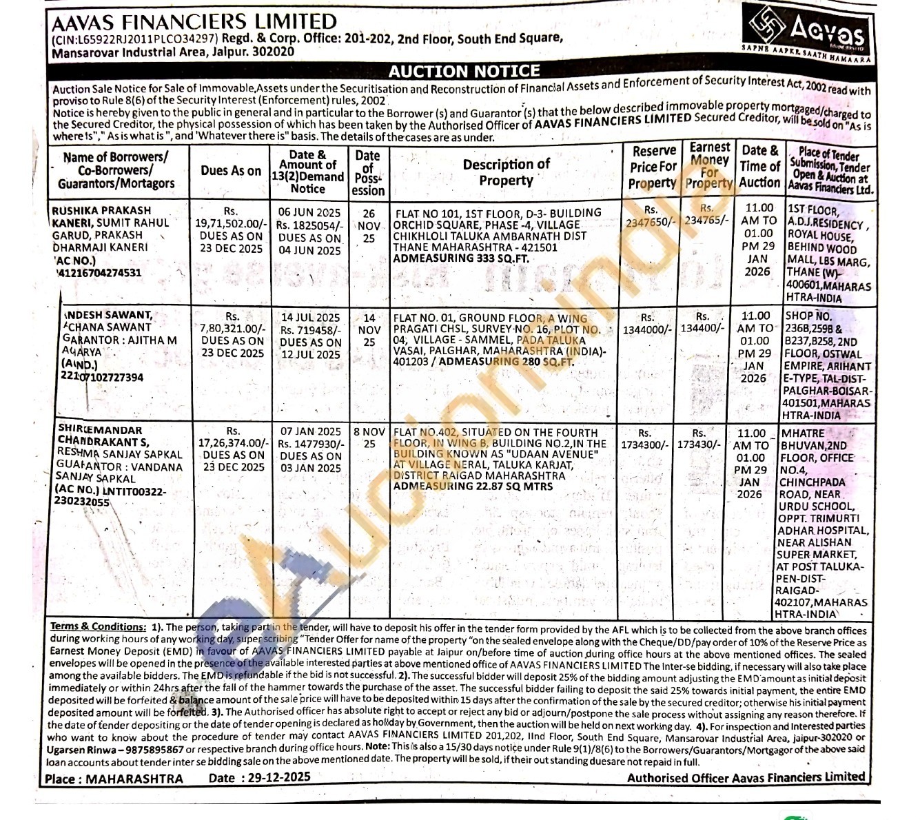 3) FLAT NO.402, SITUATED ON THE FOURTH FLOOR, IN WING B, BUILDING NO.2, IN THE BUILDING KNOWN AS "UDAAN AVENUE" AT VILLAGE NERAL, TALUKA KARJAT, DISTRICT RAIGAD MAHARASHTRA ADMEASURING 22.87 SQ MTRS