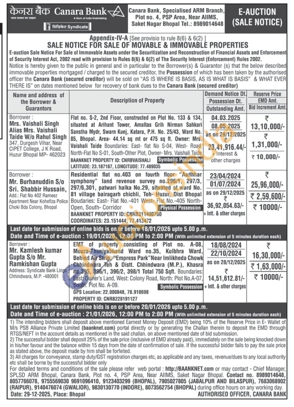 3) EMT of property consisting of Plot no. A-08. Mouza-Thuniyabhand Ward no.35, Kulbhra Ward, Behind Air Strip, "Empress Park"Near Imlikheda Chowk Chhindwara Teh & Distt. Chhindwara (M.P.), Khasra no.395, 396/1, 396/2, 398/1 Total 750 Sqft. Boundaries East: Owner's Land, West: Colony Road, North: Plot No.A South: Plot No. A-09