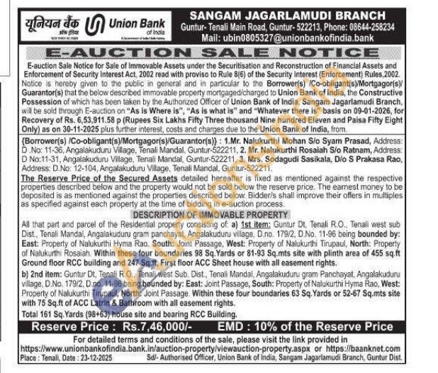 All that part and parcel of the Residential property consisting of a) 1st item: Guntur Dt. Tenali R.O., Tenali west sub Dist., Tenali Mandal, Angalakuduru gram panchayat, Angalakuduru village, D.no. 179/2, D.No. 11-96 being bounded by: East: Property of Nalukurthi Hyma Rao. South: Joint Passage, West: Property of Nalukurthi Tirupaul, North: Property of Nalukurthi Rosaiah. Within these four boundaries 98 Sq. Yards or 81-93 Sq.mts site with plinth area of 455 sq.ft Ground floor RCC building and 247 Sq.ft, First floor ACC Sheet house with all easement rights. b) 2nd item: Guntur Dt, Tenali R.O., Tenali west Sub. Dist., Tenali Mandal, Angalakuduru gram Panchayat, Angalakuduru village, D.No. 179/2, D.no. 11-96 being bounded by: East: Joint Passage, South: Property of Nalukurthi Hyma Rao, West: Property of Nalukurthi Tirupaul, North: Joint Passage. Within these four boundaries 63 Sq. Yards or 52-67 Sq.mts site with 75 Sq.ft of ACC Latrin & Bathroom with all easement rights. Total 161 Sq. Yards (98+63) house site and bearing RCC Building.
