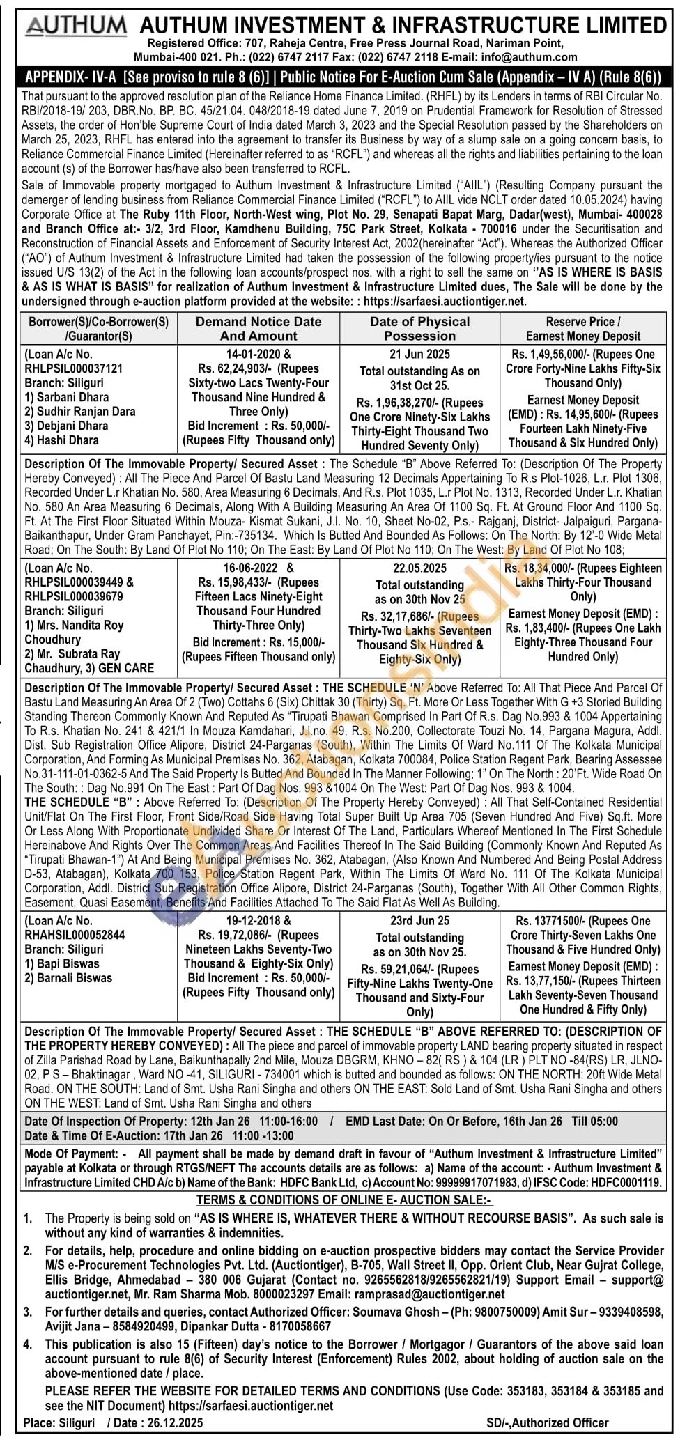 Authorized Officer: Soumava Ghosh - (Ph: 9800750009) Amit Sur-9339408598, Avijit Jana-8584920499, Dipankar Dutta -8170058667