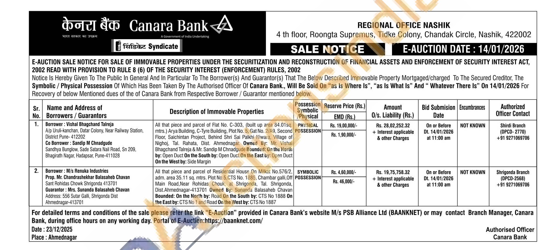 All that piece and parcel of Rasidential House On Milkat No.576/2, adm. area 35.11 sq. mtrs. Plot No.5.CTS No. 1885, Chambar gali, Off Main Road, Near Rohidas Chouk, at Shrigonda, Tal. Shrigonda, Dist. Ahmednagar-413701 Owned By: Sunanda Balasaheb Chavan Bounded: On the North by: Road On the South by: CTS No 1888 On the East by: CTS No 1 and Road On the West by: CTS No 1887