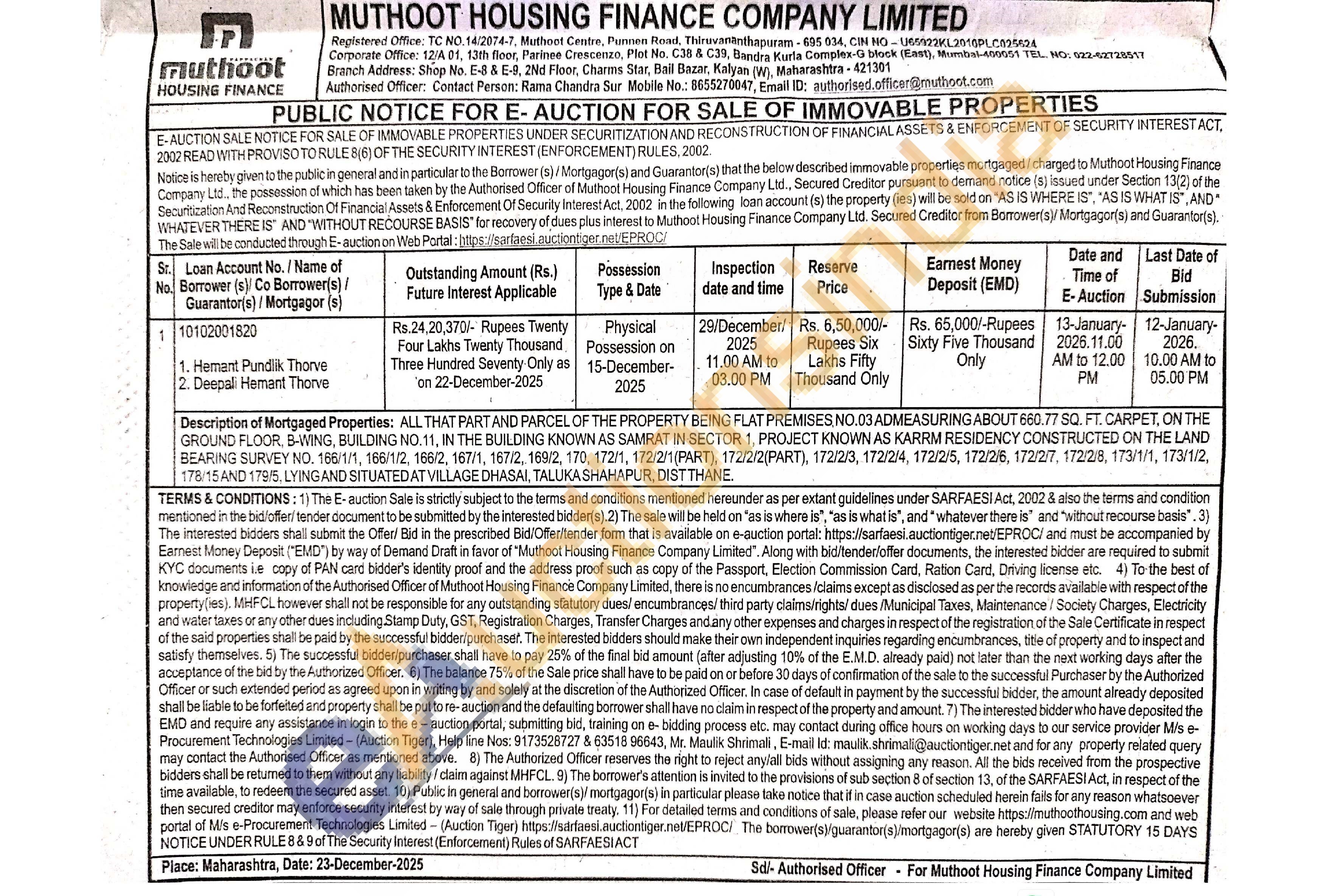 Description of Mortgaged Properties: ALL THAT PART AND PARCEL OF THE PROPERTY BEING FLAT PREMISES, NO.03 ADMEASURING ABOUT 660.77 SQ. FT. CARPET, ON THE GROUND FLOOR, B-WING, BUILDING NO.11, IN THE BUILDING KNOWN AS SAMRAT IN SECTOR 1, PROJECT KNOWN AS KARRM RESIDENCY CONSTRUCTED ON THE LAND BEARING SURVEY ΝΟ. 166/1/1, 166/1/2, 166/2, 167/1, 167/2, 169/2, 170, 172/1, 172/2/1 (PART), 172/2/2(PART), 172/2/3, 172/2/4, 172/2/5, 172/2/6, 172/2/7, 172/2/8, 173/1/1, 173/1/2, 178/15 AND 179/5, LYING AND SITUATED AT VILLAGE DHASAI, TALUKA SHAHAPUR, DISTTHANE.