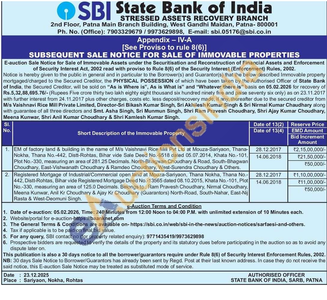 Registered Mortgage of Industrial/Commercial open land at Mouza-Sariyaon, Thana Nokha, Thana No.-442, Distt-Rohtas, Bihar vide Registered Mortgage Deed No.-13565 dated 08.10.2015, Khata No.-101, Plot No.-330, measuring an area of 125.0 Decimals. Belongs to: Ram Pravesh Choudhary, Nirmal Choudhary, Meena Kunwar, Anil Kr Choudhary & Ajay Kr Choudhary (Guarantors) North-Road, South-Nahar, East-Nij Rasta & West-Deomuni Singh.