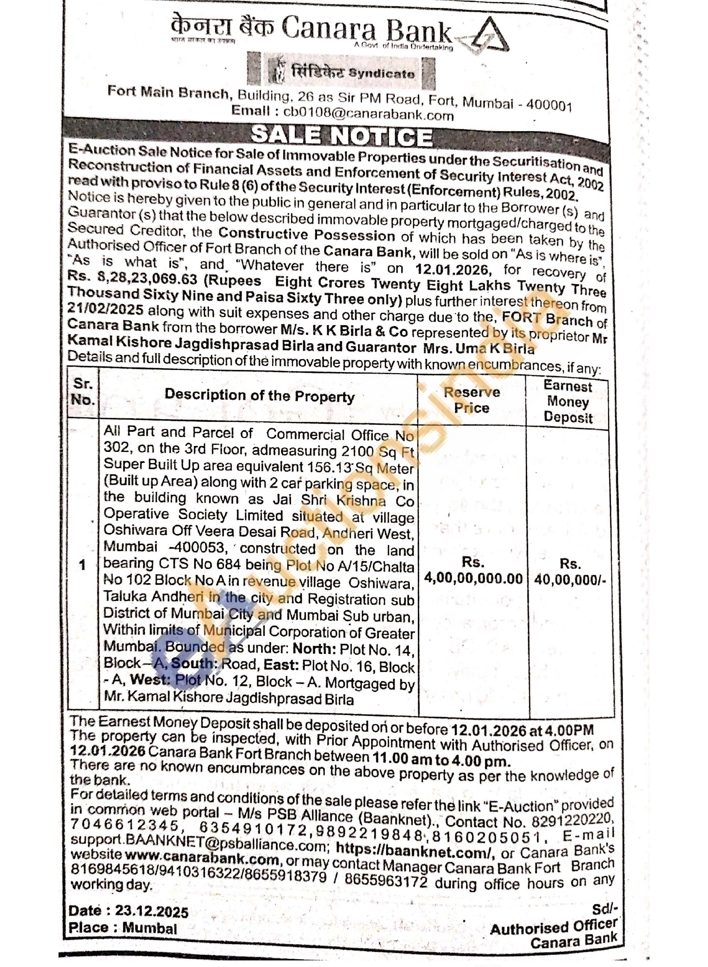 All Part and Parcel of Commercial Office No 302, on the 3rd Floor, admeasuring 2100 Sq Ft Super Built Up area equivalent 156.13 Sq Meter (Built up Area) along with 2 car parking space, in the building known as Jai Shri Krishna Co Operative Society Limited situated at village Oshiwara Off Veera Desai Road, Andheri West, Mumbai -400053, constructed on the land bearing CTS No 684 being Plot No A/15/Chalta No 102 Block No A in revenue village Oshiwara, Taluka Andheri in the city and Registration sub District of Mumbai City and Mumbai Sub urban, Within limits of Municipal Corporation of Greater Mumbai. Bounded as under: North: Plot No. 14, Block-A, South: Road, East: Plot No. 16, Block -A, West: Plot No. 12, Block - A. Mortgaged by Mr. Kamal Kishore Jagdishprasad Birla