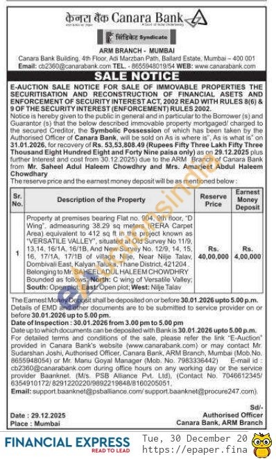 Property at premises bearing Flat no. 904, 9th floor, "D Wing, admeasuring 38.29 sq meters (RERA Carpet Area) equivalent to 412 sq ft in the project known as "VERSATILE VALLEY", situated at Old Survey No 11/9, 13,14, 16/14, 16/18, And New Survey No. 12/9, 14, 15, 16, 17/1A, 17/18 of village Nije, Near Nilje Talav, Dombivali East, Kalyan Taluka, Thane District, 421204 Belonging to Mr. SAHEELADUL HALEEM CHOWDHRY Bounded as follows: North: C wing of Versatile Valley: South: Open plot: East: Open plot; West: Nilje Talav
