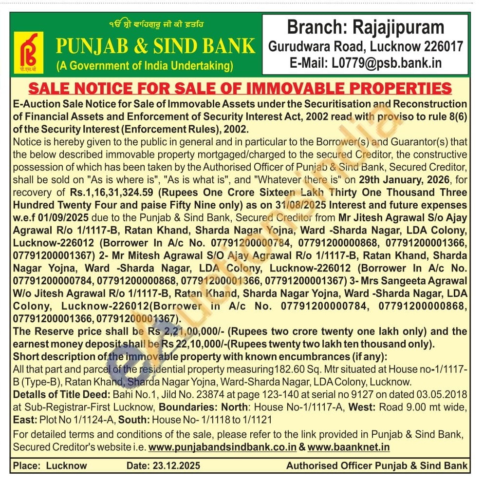 All that part and parcel of the residential property measuring 182.60 Sq. Mtr situated at House no-1/1117-B (Type-B), Ratan Khand, Sharda Nagar Yojna, Ward-Sharda Nagar, LDA Colony, Lucknow. Detalls of Title Deed: Bahi No. 1, Jild No. 23874 at page 123-140 at serial no 9127 on dated 03.05.2018 at Sub-Registrar-First Lucknow, Boundaries: North: House No-1/1117-A, West: Road 9.00 mt wide, East: Plot No 1/1124-A, South: House No-1/1118 to 1/1121