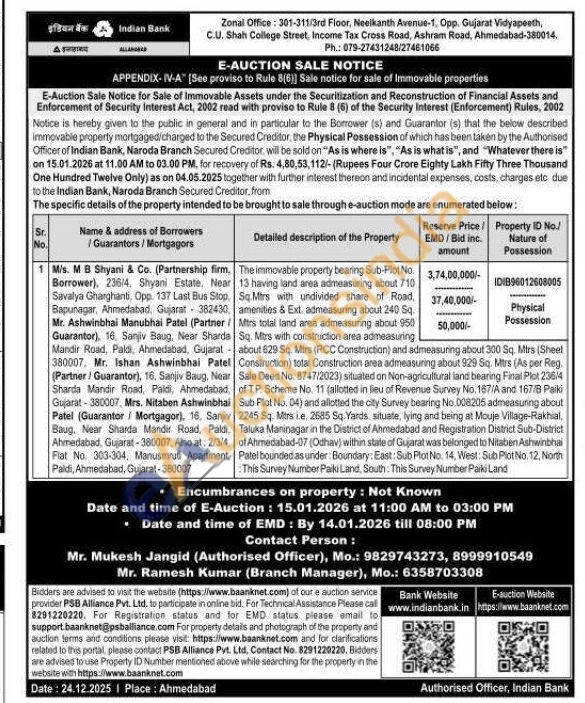 The immovable property bearing Sub-Plot No.13 having land area admeasuring about 710 Sq.Mirs with undivided share of Road, Mtrs total land area admeasuring about 950 Sq. Mtrs with construction area admeasuring about 629 Sq. Mtrs (RCC Construction) and admeasuring about 300 Sq. Mtrs (Sheet Construction) total Construction area admeasuring about 929 Sq. Mitrs (As per Reg Sale Deed No. 8747/2023) situated on Non-agricultural land bearing Final Plot 236/4 of TP. Scheme No. 11 (allotted in lieu of Revenue Survey No. 167/A and 167/8 Paiki Sub Plot No. 04) and allotted the city Survey bearing No. 008205 admeasuring about 2245 Sq. Mtrs ie. 2685 Sq. Yards situate, lying and being at Mouje Village-Rakhial, Taluka Maninagar in the District of Ahmedabad and Registration District Sub-District of Ahmedabad-07 (Odhav) within state of Gujarat was belonged to Nitaben Ashwinbhai Patel bounded as under: Boundary: East: Sub Plot No. 14, West: Sub Plot No. 12, North This Survey Number Paiki Land, South. This Survey Number Parki Land