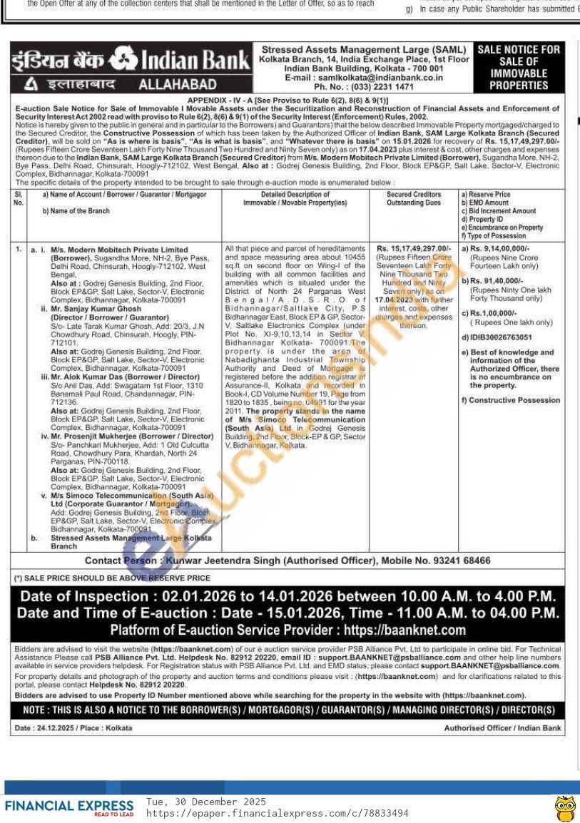 All that piece and parcel of hereditaments and space measuring area about 10455 sq.ft on second floor on Wing-l of the building with all common facilities and amenities which is is situated under the District of North 24 Parganas West Bengal/ADSRO of Bidhannagar/Saltlake City. PS Bidhannagar East, Block EP & GP, Sector V. Saltlake Electronics Complex (under Plot No. XI-9,10,13,14 in Sector V Bidhannagar Kolkata 700091 00091 The property is under the area of Nabadighanta Industrial Township Authority and Deed ved of of Mortgage registered before the addition registrar of Assurance-II, Kolkata and recorded in Book-1. k-1, CD Volume Number 19, Page from 1820 to 1835, being no. 04991 for the year 2011. The property stands in the name of Mis Simoco Telecommunication (South Asia) Ltd in Godrej Genesis Building, 2nd Floor, Block-EP & GP, Sector V. Bidhannagar, Kolkata