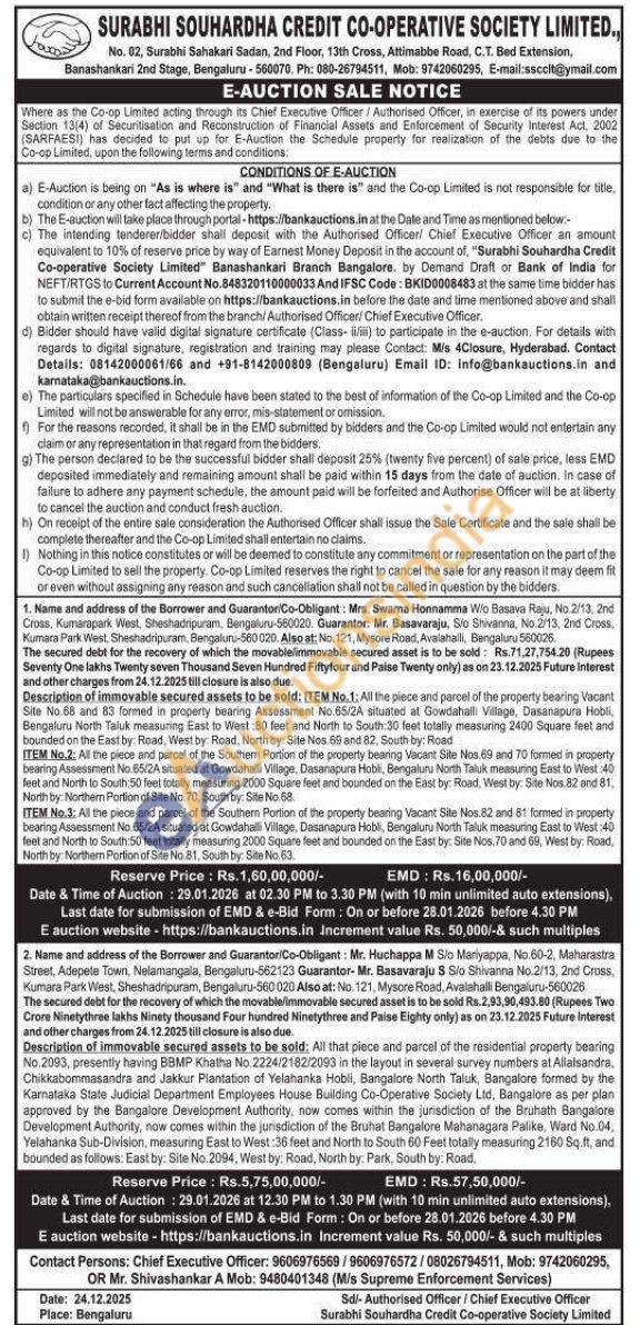 All that piece and parcel of the residential property bearing No. 2093, presently having BBMP Khatha No. 2224/2182/2093 in the layout in several survey numbers at Allalsandra, Chikkabommasandra and Jakkur Plantation of Yelahanka Hobli, Bangalore North Taluk, Bangalore formed by the Karnataka State Judicial Department Employees House Building Co-Operative Society Ltd, Bangalore as per plan approved by the Bangalore Development Authority, now comes within the jurisdiction of the Bruhath Bangalore Development Authority, now comes within the jurisdiction of the Bruhat Bangalore Mahanagara Palike, Ward No.04, Yelahanka Sub-Division, measuring East to West :36 feet and North to South 60 Feet totally measuring 2160 Sq.ft, and bounded as follows: East by: Site No.2094, West by: Road, North by. Park, South by: Road.