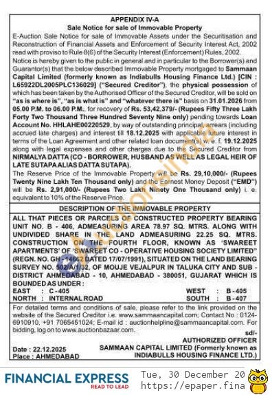 ALL THAT PIECES OR PARCELS OF CONSTRUCTED PROPERTY BEARING UNIT NO. B 406, ADMEASURING AREA 78.97 SQ. MTRS. ALONG WITH UNDIVIDED SHARE IN THE LAND ADMEASURING 22.25 SQ. MTRS. CONSTRUCTION ON THE FOURTH FLOOR, KNOWN AS SWAREET APARTMENTS OF 'SWAREET CO-OPERATIVE HOUSING SOCIETY LIMITED" (REGN. NO. GH-14662 DATED 17/07/1991), SITUATED ON THE LAND BEARING SURVEY NO. 502/A/1/32, OF MOUJE VEJALPUR IN TALUKA CITY AND SUB-DISTRICT AHMEDABAD 10, AHMEDABAD-380051, GUJARAT WHICH IS BOUNDED AS UNDER: