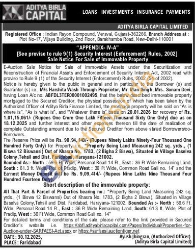 Short description of the immovable property: All That Part & Parcel of Properties bearing no.: "Property Being Land Measuring 242 sq. yrds., (1 Biswa 12 Biswansi) Out of Khasra No. 1783, (2 Bigha 2 Biswa), Situated in Village Baselva Colony, Tehsil and Dist. Faridabad, Harayana-121002. Bounded As: North: 59.6 Ft. Wide, Personal Road 14 Ft., East: 36 Ft Wide Remaining Land, South: 61.3 ft. Wide, Plot of Pradip, West: 36 Ft Wide, Common Road Gali no. 14"