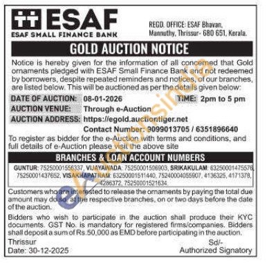 ESAF SMALL FINANCE BANK Gold Auctions Auction in Thrissur