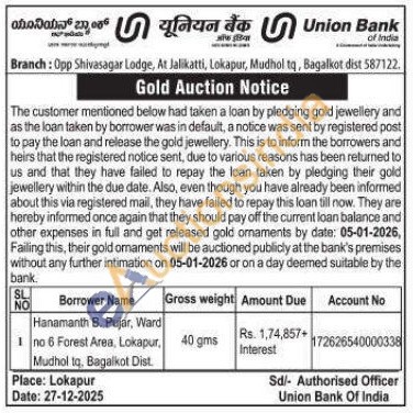 Union Bank of India Gold Auctions Auction in Bagalkot