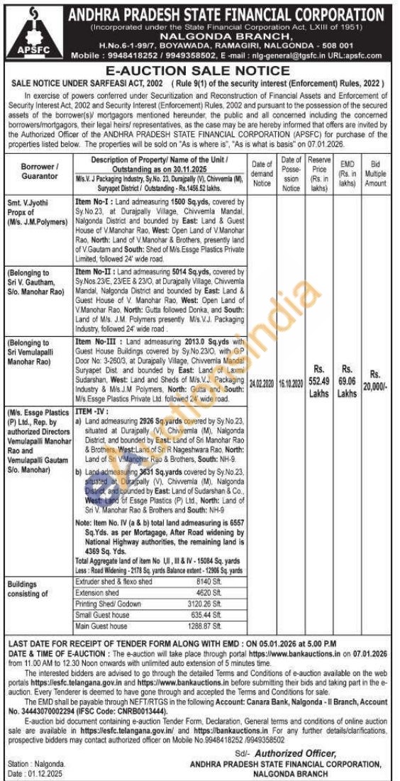 ITEM-IV: a) Land admeasuring 2926 Sq.yards covered by Sy. No. 23. situated at Durajpally (V), Chivvemia (M), Nalgonda District and bounded by East: Land of Sn Manohar Rao & Brothers, West Land of Sri R Full Description Available in The Sale notice